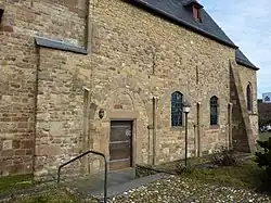 Von einem einschiffigen frühromanischen Bau ist der wohl noch dem späten 11. Jahrhundert angehörende vorgesetzte Turm erhalten, dessen Bruchsteinmauerwerk mit römischen Ziegelresten durchsetzt ist. Außen ist er ungegliedert bis auf eine flache Blendgliederung im dritten Geschoss und je zwei Schallfenster im Glockengeschoss, die im Westen und Osten als Zwillingsarkaden ausgebildet sind. Innen ist das Erdgeschoss flachgedeckt und zum Schiff in zwei Rundbögen geöffnet. Im Obergeschoss befindet sich eine Kapelle mit Sitzbank vor der Apsisnische. Der kreuzrippengewölbte Chor und die Sakristei an dessen Nordseite, stammen von einem dreischiffigen Bau des 15. Jahrhunderts. Im Chor befinden sich Reste einer 1517 datierten Rankenausmalung und ein ausgemauerter Altartisch mit Kantensäulen, der noch dem 11./12. Jahrhundert angehört. Vom Langhaus ist nach Abbruch der Seitenschiffe (18. Jahrhundert und 1913) nur das um 1500 zur zweischiffigen Halle ausgebaute Mittelschiff erhalten, in seiner Südwand ist das spätgotische Sandsteinportal des ehemaligen Seitenschiffs eingebaut. Innen befindet sich ein Kreuzrippengewölbe auf achteckigen Mittelpfeilern ohne Kapitelle, die Rippen sind an der Turmwand auf Konsole, über dem Scheitel des Triumphbogens auf wappentragender Halbfigur abgesetzt.