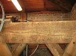 Im Dachgebälk des Turmes der Alten Kirche befindet sich eine Inschrift, die vom 20. Mai 1792 stammt. Offensichtlich ist zu diesem Zeitpunkt eine Restaurierung oder ein Neubau des Turmhelmes erfolgt. Aus der Inschrift ist zu entnehmen, wer zum Ende des 18. Jahrhunderts verantwortlich in der Kirchengemeinde Kellen tätig war: Pastor Georg Joes van Zutphen (1777–1806 Pfarrer in Kellen); Küster R. Jansen; De Heren Schepens (Schöffen) H. Fingerhoet, P. Verheien und Kerckmeister (Verwalter der Mobilien und Immobilien der Kirchengemeinde) D. Jos. H. Nüy. Die Durchführung der Zimmereiarbeiten oblag einem Handwerker aus dem benachbarten Griethausen. Dessen Name findet sich ebenfalls auf einem Balken im Turmgebälk. Es war H. Koenen.