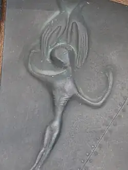 - Kirchenportal am Westturm aus dem Jahre 1955; Waldemar Kuhn – Darstellung der Schöpfung, des Sündenfalls und der Erlösung in Kupferbeschlag; Holzunterlage von Josef Kopetzky