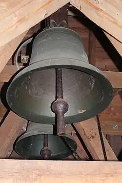 Im Jahr 1595 wurde eine Glocke von Hans Kerle aus Frankfurt gegossen, eine zweite im Jahr 1723.[4] Eine gesprungene Glocke wurde 1888 von Rincker in Sinn umgegossen.[8] Nachdem 1917 die kleine Glocke für Rüstungszwecke abgeliefert worden war, lieferte die Firma Rincker im Jahr 1923 zwei neue Bronzeglocken, von denen die größere 1942 abgeliefert werden musste. Als Ersatz schaffte die Gemeinde 1953 eine neue Glocke an.