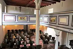 Erhalten ist ein hölzernes Vortragekreuz, das mit dem Jahr 1688 bezeichnet ist.[1] Als Altar dient ein einfacher Holztisch mit einem schlichten Altarkreuz ohne Kruzifix. An der Südwand ist ein großes hölzernes Kreuz angebracht, das von den griechischen Buchstaben Alpha und Omega flankiert wird. Ein mittelgroßes Kruzifix hängt an der Westwand unter der Balkendecke. Als Kirchengestühl dienen bewegliche Einzelstühle. In der Nordostecke ist eine elektronische Orgel aufgestellt, die gestiftet wurde.[5]
