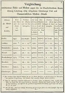 1765 ist im Kurfürstentum Braunschweig-Lüneburg nach „öfteren Irrungen“[1] der Calenbergische Fuß „gehörig berichtigt, und im ganzen Churfürstenthume gleichförmig eingeführet“[1] worden. Eine Hannöversche Meile hatte 32.000 Calenberger Fuß.[2]