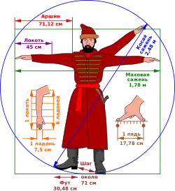 Die ältesten russischen Maße, die bis ins 20. Jahrhundert verwendet wurden, waren die Elle (Arschin) mit den Unterteilungen zu 1⁄4 und 1⁄16 sowie der Klafter (Saschen). Anfang des 18. Jahrhunderts wurde die Elle als 28 englische Zoll (englisch inches) definiert.