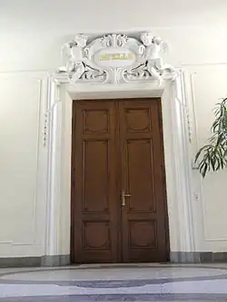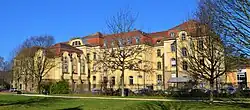 Der dreigeschossige Bau hat die Grundrissform eines E, wobei der mittlere Balken als Kapellenbau weiter vorgezogen ist. Der Mittelrisalit war von einem Dachreiter mit Glocken bekrönt, der mittlerweile abgebrochen wurde. Im zweiten Obergeschoss des Mittelrisalits befindet sich eine mit Stuck verzierte Aula, die über eine Orgel verfügt.