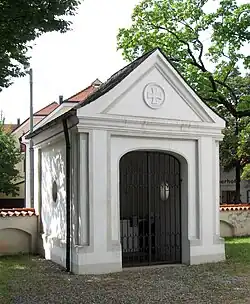 Außen befindet sich eine kleine offene Kapelle. Diese stellt ein Beinhaus dar, in dem die Schädel von Verstorbenen hinter Eisengitter aufbewahrt werden. Über Namen oder Herkunft der Gebeine gibt es keine Informationen.