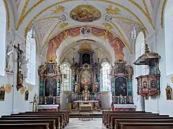 Der Hauptraum ist rechteckig unter einer Flachtonne mit Stichkappen, die durch mit auf flachen Pilastern aufsetzenden Gurtbogen gegliedert ist, das Gewölbe weist eine reiche, farbig gefasste Stuckierung von Peter Franz Appiani auf.