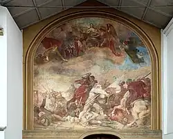 An der nördlichen Außenwand unter einem Satteldach über dem Portal stellt ein großes Fresko von Wilhelm Lindenschmit d. Ä. aus dem Jahr 1830 die Sendlinger Bauernschlacht 1705 dar. Das Fresko und der übrige Kirchenbau wurden 2003–04 gründlich restauriert, um für den 300. Jahrestag des Aufstandes zu Weihnachten 2005 gerüstet zu sein.
