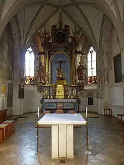 Der hochbarocke Hochaltar ist eine zweisäulige Arbeit des Kistlers (Schreiners) Thomas Ziegler und des Bildhauers Johannes Schenk (1669). Das Altarblatt des Innsbrucker Malers Johannes Hartwig ist verloren, an seiner Stelle ist seit dem 18. Jahrhundert eine barocke Pietà aufgestellt. Der ehemalige südliche, gleichzeitige Seitenaltar wurde an die westliche Turmwand verschoben, da er sonst die freigelegten Wandmalereien verdecken würde. Den früheren linken Seitenaltar gab man 1959 an die Münchner Nikolaikirche (Gasteig) ab. In den Chorfenstern befinden sich einige gotische Glasmalereien der Zeit um 1400. Neben der Verkündigung sind zwei der „Heiligen Drei Könige“ zu sehen, eine andere Scheibe zeigt die Heiligen Anton und Leonhard. In die Wände sind einige Grabsteine des 16. und 17. Jahrhunderts eingelassen.