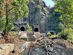- Der Straßentunnel der Ahrtalstraße, 1834 eröffnet und als Attraktion bestaunt,[11] zeigt am unteren Tunnelausgang die bis in den Tunnel gestiegenen Hochwasser an. Dabei auch den Stand des verheerenden Hochwassers von 1910.