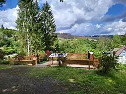 Anfang der 1950er Jahre wurde der Landkreis Zellerfeld in das Förderprogramm für Kommunen im Zonenrandgebiet aufgenommenen. Durch das damit zur Verfügung stehende Geld begann man damit, die Stadt wieder touristisch aufzubauen. Park und Grünanlagen wurden neu errichtet und die Infrastruktur optimiert. Wesentlich dazu beigetragen hat der 1953 gegründete Verkehrsverein.[67] 1956 errichtete die Stadt in der Oberstraße das erste Feuerwehrhaus, das ein zu kleines Spritzenhaus auf dem Gelände der Brauerei ablöste.[68] 1957 eröffnete die neue Schule in der Rothenberger Straße.[63] Erste Beratungen für den Bau eines Ferienparks auf dem bis dahin unbebauten Glockenberg fanden am 4. Juni 1968 statt und sollten eine Antwort auf den steigenden Bedarf an Ferienwohnungen in der Stadt stellen. Altenau konnte zu diesem Zeitpunkt über 428.121 Übernachtungen aufgeteilt auf 3.000 Gästebetten verbuchen[69] 1970–1972 ließ die Engelhardt-Gruppe aus Hannover für 100 Millionen DM den Ferienpark Glockenberg durch die Frankfurter Firma Philipp Holzmann errichten. Hierfür wurde eigens ein Wohnlager für rund 100 jugoslawische Bauarbeiter eingerichtet, das bis zum März 1972 bestand.[69] Baubeginn war am 1. April 1970 bei 80 Zentimeter Schneelage und die Grundsteinlegung erfolgte am 28. Oktober desselben Jahres. Der Ferienpark umfasst neun Hochhäuser mit bis zu 14 Stockwerken, in denen sich über 1200 Wohnungen und verschiedene Einzelhandelsgeschäfte befinden.[70] Neben den Hochhäusern errichtete man auch weitere Ringstraßen mit Wohngebäuden sowie ein Wellenbad, eine Eissporthalle und einen Kindergarten auf dem Glockenberg. Bereits ein Jahr nach der Eröffnung 1973 konnten schon etwa 900 der 1200 Appartements vermittelt werden. Die Übernachtungszahlen beliefen sich auf 558.000 Übernachtungen, verteilt auf 5400 Fremdenbetten. Pläne zur Errichtung einer Seilbahn mit Skigebiet vom Mühlenberg auf den Bruchberg wurden aus Gründen des Naturschutzes nicht umgesetzt.[71] Am 10. Februar 1972 erhielt die Stadt vom Hildesheimer Regierungspräsidenten die Anerkennung zum Heilklimatischen Kurort.[67] Im selben Jahr wurde Altenau Teil der Samtgemeinde Oberharz. 1976 verkehrte ein letzter Zug auf der Innerstetalbahn, die Strecke wurde anschließend demontiert. 1979 nahm man das heutige Feuerwehrhaus in der Großen Oker in Betrieb, nachdem seit der Anschaffung einer Drehleiter der Platz im alten Feuerwehrhaus in der Oberstraße nicht mehr ausreichte. Bis in die 1980er Jahre entstand das Wohnviertel im Tal der Kleinen Oker, das von alten Kurvillen der 1920er Jahre, aber auch von modernen Gebäuden der 1970er und 1980er Jahre geprägt wird. Es erstreckt sich über die Straße Kleine Oker, den Bergmannsstieg und die Straße „Am Kunstberg“
