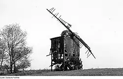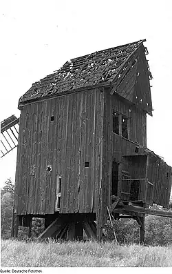 Die Altenoer Bockwindmühle stand nach den diversen Ausgaben des Messtischblattes Nr. 4148 Luckau etwa 200 Meter westlich des Dorfkerns.[17] Über deren Geschichte ließ sich bisher nur wenig ermitteln. Sie stand jedenfalls bereits 1812, denn sie ist in der Topographisch-militärische(n) Karte von Sachsen bereits verzeichnet.[18] 1818 ist sie in der Topographisch-statistische(n) Uebersicht des Regierungsbezirks Frankfurth a. d. O. erwähnt,[9] ebenso in den folgenden topographischen Beschreibungen von 1844[10] und 1867.[12] Der Klockhaus von 1935 nennt Otto Budemann als Mühlenbesitzer.[19] Das Adressbuch für den Kreis Luckau führt dann 1938 schon Eduard Budemann als Müller und Landwirt auf.[20] 1972 stand die Bockwindmühle zwar ruinös und nur noch mit zwei beschädigten Flügeln, aber noch mit löchrigen Dach und weitgehend intakter Verkleidung da. Schon 1977 war das Dach nicht mehr vorhanden, auch die Verkleidung war weitgehend verschwunden. Die Altenower Bockwindmühle muss in den folgenden Jahren abgebrochen worden sein.