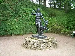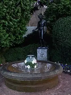Weitere „Kuriositäten“ wurden in das entstehende Wegenetz eingefügt. Am Hauptzugang trifft man auf die malerische, aus Sandstein gefertigte Ruhebank. Ein jetzt durch die Verwitterung schon weniger auffälliger Sinnspruch F·V·R·F·A·V·L·E mag manchem Besucher die Benutzung vergällt haben.[Anmerkung 6] Der Förderverein Altenstein-Glücksbrunn konnte die Sitzbank wie auch die steinerne Sonnenuhr im Innenpark mit Spendengeldern in den letzten Jahren restaurieren.[18] Zu erwähnen sind weiterhin noch die Idolino-Statue mit Brunnen und die Statue Artemis mit Reh sowie das große Fontänenbecken vor dem Schloss.