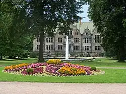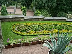 Die „Rabatten- und Zopfbeete“ bilden einen farbenprächtigen Kontrast zum Grün der Wiesen und Gehölze. Ursprünglich sollte der etwa 200 Meter betragende Raum zwischen Schloss und Wirtschaftstrakt mit Stallungen, Remisen, Küchen und Unterkünften für die Verwaltung und das Personal für die Anlage kunstvoll eingefasster Wiesenflächen, Rabatten und Blumenbeeten genutzt werden.[12][Anmerkung 2] Um das Jahr 2000 wurde wieder mit der historischen Bepflanzung des Rundbeetes sowie mit der Neuanlage der Zopfbeete an den Schlossterrassen begonnen.