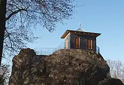 Das „Türkenzelt“ und das „Chinesische Häuschen“ (erbaut um 1800) waren dem Zeitgeschmack entsprechende Kuriositäten. In den Sommermonaten wurde ein Türkenzelt auf der großen Wiese beim Schloss aufgestellt, es diente den Gästen als Schattenspender.[Anmerkung 4] Dem an Chinoiserien angelehnten Zeitgeschmack folgend wurde der Bau eines Chinesischen Häuschens auf einem schroffen Felsturm in Auftrag gegeben. Das Gebäude wird über eine in den Fels gehauene Treppe mit 33 Stufen erreicht, es erhielt als besondere Zierde ein Glockenspiel aus Lauschaer Glas und im Felsen wurde an geeigneter Stelle eine Äolsharfe eingebaut, so dass die Besucher des Pavillons bei Windbewegungen durch zufällig entstehende Klänge und Töne überrascht und unterhalten wurden. Während die Äolsharfe schon lange nicht mehr vorhanden ist und auf Grund des Baumbewuchses wohl wirkungslos wäre, wurde das wiederaufgebaute Chinesische Häuschen am 29. November 2011 der Stiftung übergeben.[15][Anmerkung 5]