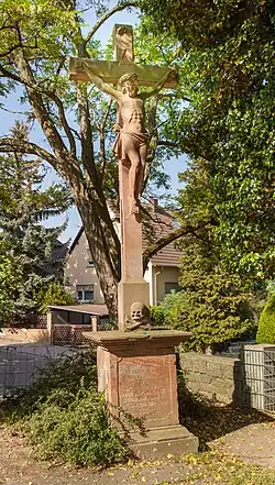 Zum Gelände gehört ein Eingang, der reliefierte Torpfeiler im Stil des Klassizismus enthält. Zudem existiert vor Ort ein Friedhofskreuz, das mit der Jahreszahl 1823 bezeichnet ist und von Jacob Sommer gestiftet wurde. Beide Objekte stehen unter Denkmalschutz.