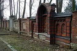 Zu den größten Bauwerken auf dem Friedhof zählen die 1901–1902 erbaute Friedhofskapelle aus rotem Backstein-Mauerwerk im neogotischen Stil sowie die Grabkapelle der Familie Beyer im neoromanischen Stil und verputzter Fassade. Zudem gab es ein Friedhofsverwalterhaus, das mittlerweile abgerissen wurde und die Ruine des alten Leichenhauses.