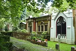 | Blick von Osten auf die Friedhofskapelle und den Anbau der Metropolitankirche | |