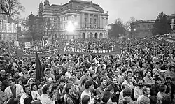 Am 23. Oktober 1989 war der Alte Garten Ausgangspunkt der ersten Schweriner Montagsdemonstration. Auf eine Kundgebung des Neuen Forums reagierten Demokratischer Block und Rat der Stadt mit einer Gegenveranstaltung, zu der man zahlreiche Bürger mit Bussen heranschaffte und den Willen zum Dialog proklamierte, jedoch dem Neuen Forum kein Rederecht zuerkannte. Die Anhänger der Veranstaltung des Neuen Forums starteten vom Platz aus zu einem Demonstrationszug durch die Stadt, dem sich auch zahlreiche Teilnehmer der Gegenveranstaltung und des Friedensgebetes im Dom anschlossen. Insgesamt nahmen an der Montagsdemonstration etwa 40.000 Menschen teil.[8]