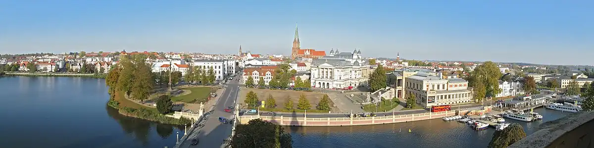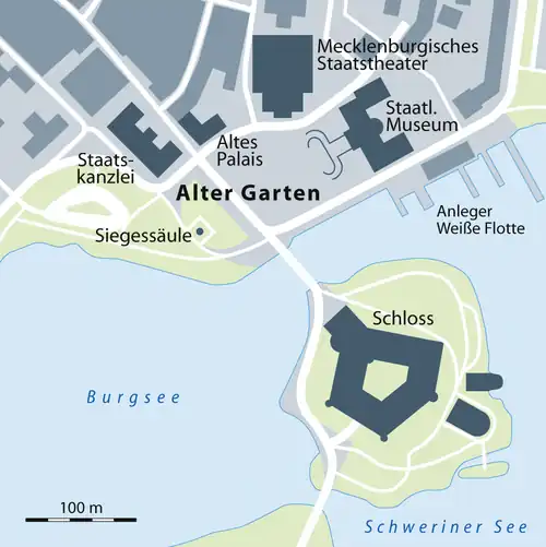 Der Alte Garten ist ein zentraler, repräsentativer Platz in Schwerin, der von Prachtbauten umrahmt ist. Er wird auf zwei Seiten vom Schweriner See und dem Burgsee begrenzt. Sowohl die Anlage des Platzes selbst als auch die dort befindlichen und angrenzenden Gebäude – Schweriner Schloss, Theater, Museum, Altes Palais und Staatskanzlei – sind in der Denkmalliste der Stadt Schwerin aufgeführt.[1] Die Nutzungsgeschichte des Platzes beginnt vermutlich bereits im 9. Jahrhundert im Umkreis der Obodritenburg Zuarin.[2] Im Laufe der Zeit wandelte sich die Nutzung des Platzes mehrmals bis zur modernen Nutzung für Versammlungen und Veranstaltungen sowie als touristisches Zentrum.