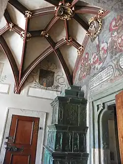 Der Holzboden stammt wahrscheinlich aus dem 18. Jahrhundert. Vom Deckengewölbe hängen fünf Renaissance-Kronleuchter, drei davon sind die ursprünglichen aus dem 16. Jahrhundert, zwei sind Kopien aus dem 20. Jahrhundert. Der ganze Raum wird von beiden Seiten von hohen Renaissancefenstern beleuchtet.[5][7][4]