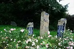 - im Vordergrund der dreiteilige Gedenkstein des Bürgervereins aus dem Jahr 2000 mit den Namen der ermordeten und verschollenen jüdischen Bürger Kaldenkirchens, dazu gehört eine liegende Platte mit Inschrifttafel davor: „Zum Gedenken an die jüdische Gemeinde und die 1933–1945 durch die Nationalsozialisten ermordeten und verschollenen jüdischen Bürger aus Kaldenkirchen. Der Bürgerverein Kaldenkirchen, August 2000“