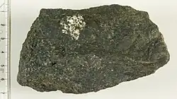 Die Saussuritisierung ist ein Vorgang, bei dem durch hydrothermale oder epizonal-metamorphe Prozesse Plagioklase in „Saussurit“ umgewandelt werden.[6] Unter „Saussurit“ wird dabei ein dichtes, weißes bis lichtgrünes Gemenge von Zoisit, Skapolith, Epidot, Serizit u. a. Mineralen verstanden. „Saussurit“ entsteht durch thermale oder hydrothermale Einwirkung in Tiefengesteinen wie Gabbros u. a.[6] Typisch ist dabei, dass innerhalb der Plagioklase nur die Anorthit-Komponente der Kerne umgewandelt wird, während die Albit-Komponente der Außenzonen stabil bleibt. Im Resultat entstehen sogenannte „gefüllte Feldspäte“.[9]