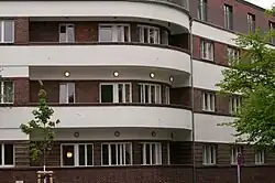 Der Backsteinbau ist durch helle durchgehende Putz- und Fensterbänder auffallend horizontal gegliedert. Es verfügt über abgerundete Balkone und ein zurückgesetztes Obergeschoss. Das Haus liegt an einer exponierten Ecklage zwischen Berkaer Straße und Sulzaer Straße. Der nördliche Riegel ist ein symmetrischer Kopfbau, dessen Mittelteil erhöht ist. Zur Sulzaer Straße hin knickt das Gebäude stumpf ab.[1]