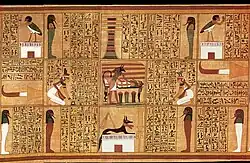 Eine zentrale Vorstellung war das Totengericht: Nach dem Tod erschien der Verstorbene vor einem Tribunal von 42 Göttern unter dem Vorsitz von Osiris. Das Herz des Verstorbenen wurde mit der Feder der Ma'at gewogen. War das Herz leichter oder gleich schwer wie die Feder, durfte der Verstorbene in das paradiesische Jenseits eingehen, war es mit Sünden belastet, wurde es vom Ungeheuer Ammit verschlungen, was die endgültige Vernichtung bedeutete.