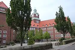 - Bei der Gestaltung des benachbarten Gebäudes der Landeszentralbank von 1922/23 orientierte man sich an dem Altbau der Schule von 1914, weshalb auf Ansichten vom Hafen aus die beiden backsteinernen Gebäude eine architektonische Einheit bilden.