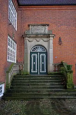 Erbaut wurde das Haus 1913 im Stil der Heimatschutzarchitektur nach Plänen des Bordesholmer Architekten und Kreisbaurats Johann Garleff. Der hochaufragende Winkelbau ist im Detail sorgfältig gegliedert. Besondere äußere Kennzeichen sind die vielen Sprossenfenster, das mit einer Schriftplatte angelegte Portal (mit Freitreppe) und die handgeschmiedeten Beschläge (Jahreszahlen und Ornamente). Innen sind neben der großen Treppe, die getäfelter Diele und der ausgemaltem Tagungssaal bemerkenswert.