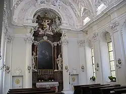 Das Innere ist ein fünfjochiger, rechteckiger Saalraum mit Tonnengewölbe und stark eingezogener, von Säulen flankierter Altarapsis. Zwei wuchtige korinthische Säulen tragen die schmale Orgelempore und trennen den Eingangsbereich vom Schiff. Der Raum ist architektonisch und ornamental reich gegliedert. Die hohen Rundbogenfenster an den Längsseiten werden von einer Kompositpilasterordnung flankiert, die Fensternischen sind von einfachen profilierten Rahmen eingefasst und durch Blattkartuschen oder Muscheln mit seitlichen Blumen- und Blattranken bekrönt. Das Gewölbe ist mit barocker Laub- und Bandlwerkstuckatur der Innsbrucker Bildhauer Anton Gigl, Andrä Gratl und Johann Singer geschmückt.