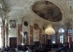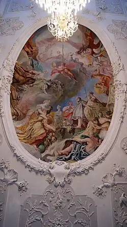 Die Wand- und Deckenfresken wurden 1734 vom damals schon berühmten Münchner Maler Cosmas Damian Asam gemalt, der aus einem Wettbewerb als Sieger hervorgegangen war. An den Wänden der Nord- und Südseite befindet sich ein Bilderzyklus, der die Reichtümer der Talschaften Tirols mit Szenen aus dem Alten Testament symbolisiert: Rachel und Jakob am Brunnen (Pustertal), das Opfer Aarons (Eisacktal), Isaak mit seinem Knecht, der mit dem Strichmaß die Getreidesäcke füllt (Vinschgau), Judith mit dem Haupt des Holofernes (Wipptal), die Königin von Saba vor Salomon (Inntal) und die Kundschafter mit Trauben aus dem gelobten Land (Etschtal). Das Deckenfresko zeigt den Weg von den irdischen Schätzen zu jenen des Geistes und des Himmels. Im Zentrum ist Graf Meinhard II. als Begründer der Einheit Tirols dargestellt, der auf die Früchte des Landes hinweist, umgeben von einem Flussgott und mehreren allegorischen Gestalten. In der Mitte des Bildes führen die Personifikationen der Wahrheit und des Glaubens von der irdischen zur himmlischen Zone zur Mutter Kirche.