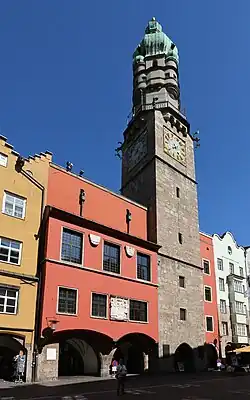 Die Amtsgeschäfte der Stadtverwaltung wurden ursprünglich in der jeweiligen Wohnung des Bürgermeisters, Stadtrichters oder Stadtschreibers abgewickelt. In der Mitte des 14. Jahrhunderts war der Verwaltungsaufwand so groß, dass ein eigenes Amtsgebäude benötigt wurde. Am 8. Mai 1358 gewährte daher der Landesfürst, Markgraf Ludwig der Brandenburger, einen Steuernachlass, der den Ankauf eines Bürgerhauses am Stadtplatz ermöglichte. Dieses wurde zum ersten Rathaus einer Tiroler Stadt umgebaut. Von 1442 bis 1450 wurde es durch Ankauf des südlich angrenzenden Hauses vergrößert und der Stadtturm erbaut. Zwischen 1450 und 1460 wurden ein weiteres schmales Haus südlich des Stadtturms erworben und die Lauben errichtet. 1496 wird eine eigene Ratstube („jnn der fürsichtigen ersamen vnnd weysen burgermeister vnnd rats zu Jnnspruggs hindern gewonlichen radstuben“) als Beurkundungsort erwähnt.[1]