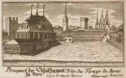 Johann Rudolf Gruner beschrieb das dritte Schützenhaus 1732 als ein grosses zwar nur höltzernrs Schiesshaus, welches auf hohen höltzernen Stüden ruhet, darunter in einer Höhle ein kühler Brunnen entspringt[1]. Das Haus folgte einem frühneuzeitlichen Typus, wie wir ihn im süddeutschen und schweizerischen Raum für Schützenhäuser kennen: im Erdgeschoss Küche und Lagerräumlichkeiten und daran angebaut eine Schiesslaube. Der erste Stock vorkragend, erreichbar über eine Aussentreppe, den Festsaal umfassend. Äusserlich ähnelte das Berner Schützenhaus mit dem Krüppelwalmdach und den Helmstangen einem spätgotischen herrschaftlichen Sommerhaus. Vor dem Schützenhaus stand der sogenannte zweite Kreuzgassbrunnen, der 1667 hierher versetzt wurde. Dieser Figurenbrunnen von 1520 zeigte einen Bärenvenner mit dem Stadtbanner, ähnlich dem Zähringerbrunnen an der Kramgasse.
