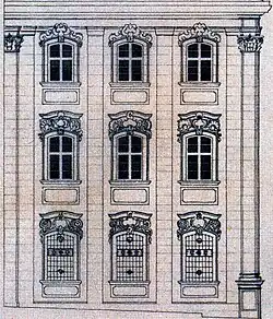 Mit einem fast quadratischen Grundriss bildete der Bau ursprünglich die Nordostecke des im späten 16. Jahrhundert zu einer vierflügeligen, einen Innenhof umschließenden Anlage erweiterten Rathauskomplexes. Der dreigeschossige Bau wurde aus regionaltypischem hellgelbem Sandstein errichtet. Die Hauptwirkung lag bis zur Zerstörung der Stadt auf der Ostfassade, die nach dem Kieselmarkt ausgerichtet war. Die – heute freigelegte – Südfassade zeigt drei Achsen und hat dieselbe Gestaltung wie die Ostfassade. Das mit Biberschwanz eingedeckte Satteldach war nach der Ostfront abgewalmt und ohne jeden Aufbau. Die heute noch bestehende Ostfassade ist in fünf Achsen unterteilt und zeigt eine aufwändige Gliederung. Schlanke Eckpilaster mit korinthisierenden Kapitellen gliedern diese. Die Pilaster stehen auf hohen fein detaillierten Postamenten und tragen das reich profilierte Gebälk. Schmale, wenig vorspringende Lisenen stützen den Architrav.[7] Den Mittelpunkt der Fassade bildete das Portal der Mittelachse. Das Portal umfasste eine – inzwischen verlorengegangene – schmiedeeiserne Eingangstüre, die eine aufwändige Leistung des Kunstschlossers Späth war. Alle Fenster zeigen auch heute noch eine flachprofilierte Umrahmung und einen stichbogigen Sturz. Unter der Fensterbank zeigen diese eine mit zarten Profilen umrahmte Brüstung. Die Fenster im Erdgeschoss waren mit aufwändig verzierten, schön ausgebauchten Gittern ausgestattet, auch eine Arbeit des Kunstschlossers Späth. Die übrigen Fenster zeigen eine gebrochene Bogenverdachung und zwischen Sturz und Verdachung mit Rocaille geschmückte Kartuschen. Über den Fensterstürzen des zweiten Obergeschosses sind auch Kartuschen angebracht worden. Kartuschen wurden mit eisernen Klammern vor dem Architrav angehängt.[8] Bemerkenswert ist das mit Rocaille geschmückte Stadtwappen über dem Portal – dort „…ein gekrönter schwarzer Adler, der im Bustschild die Buchstaben „HB“ trägt, in goldenem Feld, in das von (heraldisch) rechts die Sonne hereinstrahlt…“.[9][10]