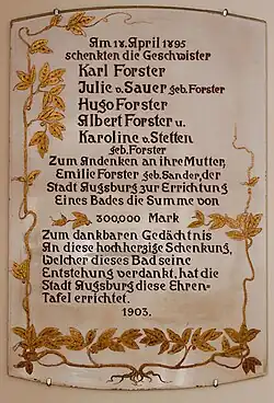 Am 18. April 1895 schenkten die Geschwister Forster, eine Industriellenfamilie (siehe Carl Ludwig Forster), der Stadt 300.000 Goldmark zur Errichtung eines bereits lange gewünschten Volksbades. Daraufhin wurden die Planungen nach Beschluss des Stadtrats 1896 durch den Oberstadtbaurat Fritz Steinhäußer mit Unterstützung des Architekten Stein begonnen. Die Spende wurde noch vor Baubeginn sogar auf 360.000 Goldmark erhöht.