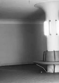 Über der Kassenhalle lag im ersten Obergeschoss als kleiner Festsaal das ovale Foyer. Die Wände dieses Festsaals waren dunkel-rotbraun mit einer Edelholztäfelung aus afrikanischen Hölzern verkleidet und mit schwarzen und silbernen Profilleisten gegliedert. Prunkstücke der Innendekoration waren die silberfarbenen Lampen und Heizkörperverkleidungen, die den Charakter des Foyers als Festsaal unterstrichen – „kleines Prunkstück schöner, vornehmer Festlichkeit“.[60] Ausgesuchte Vorhänge, Möbel und Bronzefiguren auf schwarzen Postamenten bereicherten zusätzlich den Raum. In der Zehn-Minuten-Pause war der Aufenthalt im Rauchzimmer oder im Teesalon, zwei kleinen Nebenzimmern an beiden Seiten des Foyers, möglich.[2][54]
