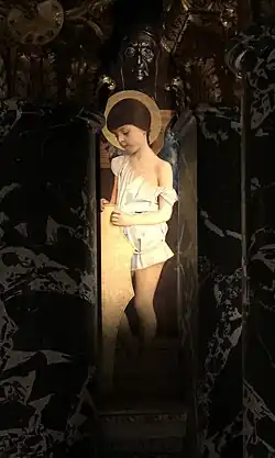 Im Interkolumnium rechts steht vor einer dunklen Büste des Dante Alighieri ein Kind in Gestalt eines Engels mit Nimbus und goldenem Rossstirnschild. Es trägt ein leichtes, weißes Gewand, dessen linker Ärmel von der Schulter gleitet.