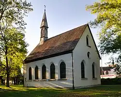 An dem Rechteckbau mit Satteldach befindet sich an der Eingangsfassade im Westen ein kleiner Vorbau. Auf der Westseite bekrönt ein zur Spitze pyramidenförmiger Dachreiter das Dach. Die Südwand hat fünf Spitzbogenfenster; die Nordwand und die Giebelwände jeweils zwei.