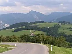 Straße vom Gmundnerberg in Richtung Grasberg. Im Hintergrund die Schlafende Griechin