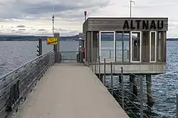 - der seit 2010 bestehende Schiffsanlegesteg, der wegen der weiten Flachwasserzone 270 Meter lang – und damit der längste Steg am Bodensee – ist.[16] Die Altnauer nennen diesen Steg wegen seiner Länge (fast so lang wie der Turm hoch ist) auch "Eiffelturm vom Bodensee".