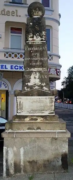 An der Straße sind bis heute Meilensteine aus Granit mit einer Höhe von etwa einem Meter auf der westlichen Straßenseite erhalten geblieben (→Liste). Diese zeigen die Entfernung nach Altona und nach Kiel in Meilen, die Initialen des dänischen Königs (FR – Fridericus Rex) mit Krone und die Jahreszahl der Fertigstellung. Die beiden auf Hamburger Gebiet noch vorhandenen Meilensteine an der Holsteiner Chaussee 49 bzw. 396 sind unter den Nummern 19403 und 19393 in die Hamburger Denkmalliste eingetragen. Aus der auf den Meilensteinen angegebenen Gesamtstrecke von 12¼ Meilen (à 7,5324 km) ergibt sich rechnerisch eine Entfernung von rund 92,3 km. Der Nullpunkt in Altona war am Ende der Rosenstraße und der Johannisstraße "Bey dem Franschen Hoff" (später Gählerplatz südlich der heutigen Einmündung der Gählerstraße in die Holstenstraße), in Kiel das Rondeel mit einem ursprünglich drei Meter hohen Sandsteinobelisk,[1] an dem auch die Alte Lübecker Chaussee beginnt.