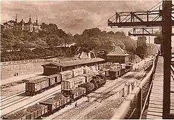 Bahnhof Altona um 1850, am rechten Rand ist ein Pferdegespann erkennbar, das eine Fracht vom Hafen herauf befördert -
