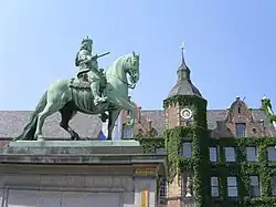 1545 wurde in einem vom Herzog am Stiftplatz zur Verfügung gestellten Gebäude das erste Gymnasium in der Stadt gegründet. In der Regierungszeit von Wilhelm dem Reichen erfolgte 1570–1573 auch der Bau des ersten Teiles des heutigen Düsseldorfer Rathauses mit roter Backsteinfassade. Für den Neubau wurde das um 1545 von der Stadt gekaufte ältere Gebäude nach 1567 ersetzt.[35] Im Oktober 1570 beauftragten Bürgermeister mit Rat der Stadt den Meister Heinrich Tuschmann aus Duisburg mit den Mauerarbeiten für das Neue Rathaus. Es folgte im März 1572 noch ein weiterer Vertrag mit Tuschmann, in dem er auch mit allen weiteren Bauarbeiten für die Fertigstellung des Gebäudes beauftragt wurde.[49] Da die Stadt nur begrenzte Mittel für den Bau des Gebäudes hatte, wurde der Herzog sowohl 1571 und 1572 mehrmals schriftlich um Unterstützung für die Finanzierung des Baus gebeten.[50] Dieses neue Gebäude, das heutige „Alte Rathaus“, war der „erste Flügel“ an dem später noch zwei weitere „Flügel“ angebaut wurden.[51] Damals grenzte das Rathaus westlich an ein Gebäude, in dem sich die Kurfürstliche Kanzlei befand. Beide Gebäude wurden später zum aktuellen Alten Flügel zusammengefasst.