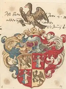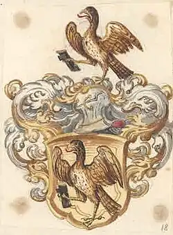 - Blasonierung des Stammwappens: In Gold ein brauner Adler mit erhobenen Flügeln, in seiner rechten Kralle einen schwarzen, verstümmelten Ast haltend.[7]