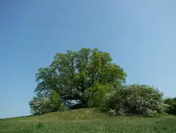 Die Evangelische Kirche ist eine ehemalige Wehrkirche und stammt in ihrer heutigen Form aus dem 16. Jahrhundert. Teile der Kirche sind jedoch wesentlich älter. Der hochmittelalterliche Kirchturm wurde wahrscheinlich nach 1200 erbaut, der frühgotische Chor um 1300. Der Kirchplatz vor dem Kirchhof war auch der mittelalterliche Gerichtsplatz.[21] Auf ihm stand die historische Gerichtslinde des Dorfes.