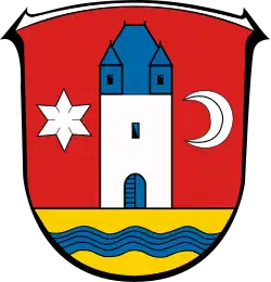 Blasonierung: „In Rot über goldenem Schildfuß mit blauem Wellenbalken ein silberner Kirchturm mit blauem Tor und blauem Dach mit 2 Ecktürmchen; beseitet von silbernem Stern und silbernem zunehmenden Halbmond.“[19] |