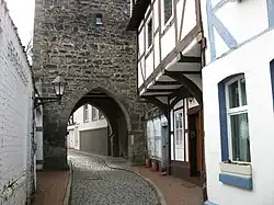 Ein Blick auf den Stadtplan von Hildesheim macht deutlich, dass die Wall- und Befestigungsanlagen im Süden des Stadtteils Neustadt unweit der Straße „Lappenberg“ eine deutliche Kehre bilden und scharf nach Südsüdwesten abknicken. Für den 30 m hohen Befestigungsturm, der um 1300 im Bereich dieser Kehre erbaut worden war, bürgerte sich etwa ab 1600 der Name „Kehrwiederturm“ ein, sein ursprünglicher Name ist nicht überliefert.[2] Möglicherweise hieß er „Kehrwehrturm“. Das Tor unter ihm wurde „Neues Hohnser Tor“ genannt und bezog sich auf das südlich gelegene Dorf Hohnsen, das im Mittelalter zu einer Wüstung wurde. Um den Turm rankt sich die Sage, dass sich ein edles Fräulein aus Hildesheim im Wald, der im Mittelalter noch bis unmittelbar an die Stadt heranreichte, verirrte und durch das Läuten einer Glocke im Turm den Weg in die Stadt zurückfand.