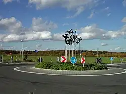Am Ortsausgang der Straße befindet sich ein Kreisverkehr. In ihm stehen Bronzevögel, die von einer ortsansässigen Gießerei gestiftet wurden und die Ortsteile der Gemeinde symbolisieren.