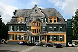 Das stattliche Villengebäude des Klinikensembles der Louise-Gueury-Stiftung steht im Hardter Wald, in freier Anlehnung an Bürgerhäuser des Bergischen Barocks. zweigeschossiger Rechteckbau mit ausgebautem und zu einer Seite abgewalmtem Mansarddach. Symmetrisch gegliederte Schauseite in neun Achsen; scheitrecht überdeckte Fenster differierender Höhe und Breite, glatt in die Laibungen eingeschnitten. Rau verputztes Erdgeschoss und vom Dach bis über das Obergeschoss greifende Verschieferung der Wände. Betonung des Mitteljoches durch einen überhöhenden Dreiecksgiebel; im Erdgeschoss durch einen dreiachsigen Vorbau, in dem der über eine zweiläufige Treppe zugängliche Hauseingang angeordnet ist. Dem den Vorbau abschließenden Walmdach ist mittig ein bis in die Dachzone hochgeführter, das Treppenhaus enthaltener Erker in Segmentbogenform eingesetzt, den jeweils fünf schmale, übereinandergeordnete Hochrechteckfenster belichten.